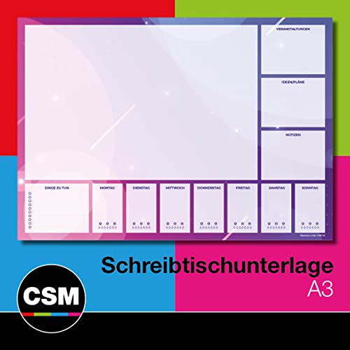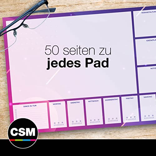 Questo sottomano viola A3 è ideale per tutti i tuoi appunti e scarabocchi. Il formato è A3 o 42 cm x 30 cm. Ci sono 50 fogli colorati stampati su carta bianca da 90 g/m². I fogli sono incollati sul bordo inferiore per evitare che si arrotolino.