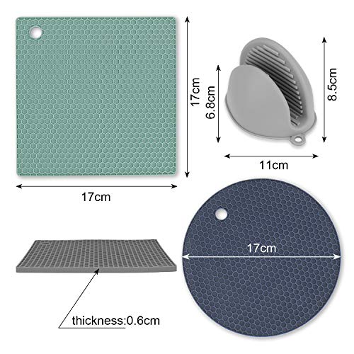 Design affidabile - le strisce sui mini guanti in silicone non solo hanno un aspetto elegante, ma offrono una funzione antiscivolo che consente di tenere facilmente diversi vasi, piatti, tazze o biscotti appena sfornati. I fori rotondi sui guanti e sui sottobicchieri servono quando appesi a un gancio per riporli facilmente senza occupare spazio aggiuntivo.