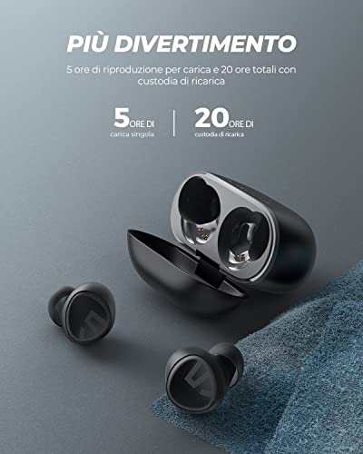 [Bluetooth 5.2 e 5 ore] - Il chipset Bluetooth 5.2 avanzato integrato offre una connessione stabile, un'ampia gamma e una trasmissione veloce per ottimizzare il vero divertimento wireless. Il basso consumo garantisce fino a 5 ore di riproduzione per carica e 20 ore in totale con la custodia di ricarica.