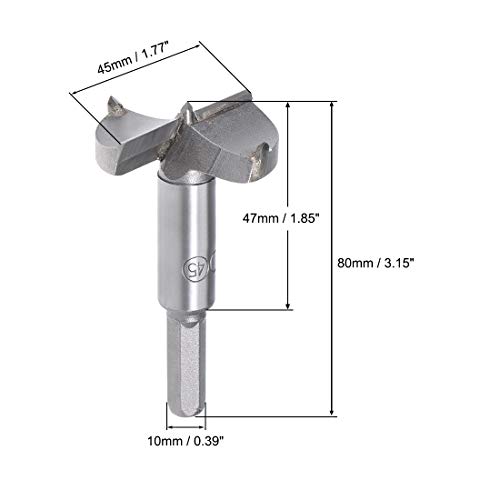 Specifiche: Diametro di perforazione.: 45 mm. Dimensioni del gambo: 10 mm. Profondità di perforazione: 47 mm. Lunghezza totale: 80 mm. Gambo esagonale, fresa in carburo cementato e corpo in acciaio temprato solido.