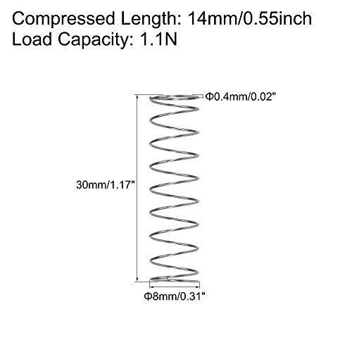 Sourcing map Molla compressa, 0,8 cm OD, 0,1 cm dimensione del filo, 1,2 cm lunghezza compressa, 3 cm lunghezza libera, capacità di carico 1.1N, grigio, 30 pezzi