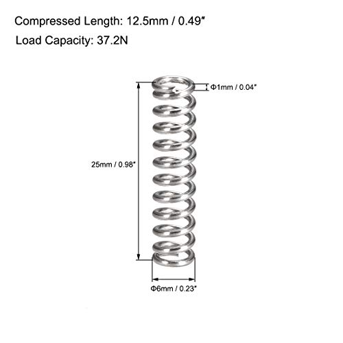 Sourcingmap, molla a compressione in acciaio inox 304, diametro 6 mm, dimensione filo 1 mm, lunghezza compressa 12,5 mm, lunghezza libera 25 mm, capacità di carico 37,2 N, tonalità argento, 20 pezzi