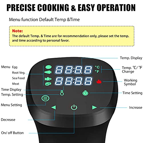 PERFETTO E PRECISO -- la cottura KEAWEO sous vide si basa sulla precisione. Il pannello di controllo LCD è a temperatura controllata da 25℃ a 95 ℃ con buona stabilità della temperatura e un intervallo di temperatura di ± 0.1 ℃. Controllo preciso del tempo (0-99 h) e funzione di temperatura costante, è possibile controllare il livello di cottura senza difficoltà.