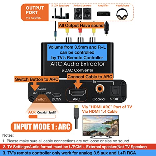 【Volume HDMI ARC CEC regolabile】 In modalità ARC, tutte le uscite hanno il suono, ma solo il volume da 3,5 mm aux e L+R RCA può essere contato dal telecomando della TV (Attenzione: utilizzando la versione HDMI 1.4 o superiore, impostare l'audio su L/PCM)