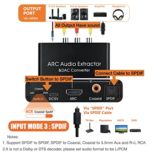 【Estrattore Audio HDMI ARC】 Funzione canale ritorno audio ed estrazione audio su segnale digitale e analogico. Ciò significa che, quando collegato a un dispositivo HDMI ARC, come il televisore con porta HDMI ARC, l'audio verrà restituito dalla TV e trasmesso a SPDIF, coassiale, L + R RCA, 3,5 mm;