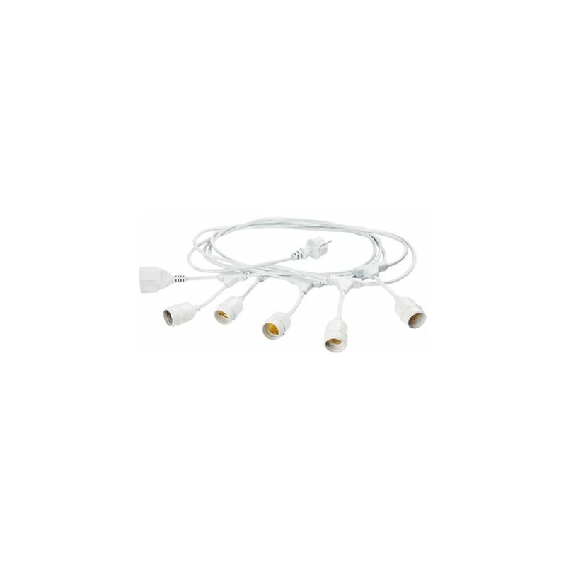 Cavo per esterno in termoplastico. Lunghezza 5 metri. 5 portalampada E27. Completo di spina e presa schuko. Alimentazione 230. Classe di protezione: IP43 Numero lampade: 5 Potenza massima lampade: 20W