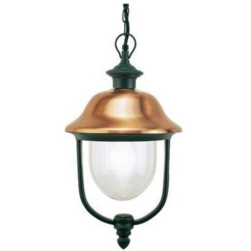 Collezione Rustica ESALTA IL TUO OUTDOOR Sospensione per esterno a 1 luce con struttura in pressofusione di alluminio grigio.. Copertura superiore in rame e diffusore in termoplastico trasparente, dotata di cavo H05RN-F 3G1. Monta lampadina (non inclusa) con altezza massima 150 mm.