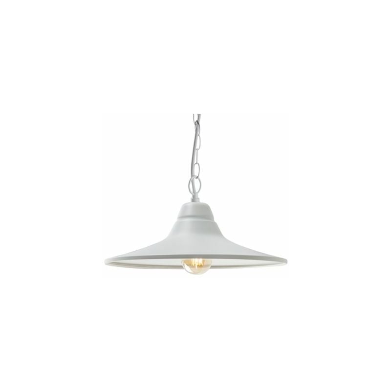 Struttura in metallo. Piatto verniciato e smaltato bianco. Controbase e accessori per il fissaggio. Sospensione con cavo H05RN-F 3G1 Portalampada in porcellana con attacco E27. Adatta per lampade a risparmio energetico. Lampada esclusa. Alimentazione 230V. Classe di protezione: IP43 Potenza massima lampade: 25W
