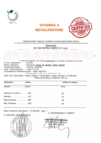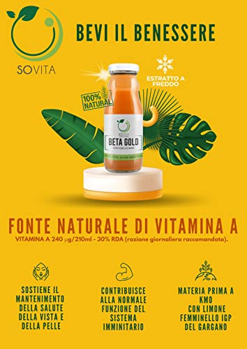 SOVITA NATURAL SUCCO puro di CAROTA,MELA e LIMONE FONTE NATURALE DI VITAMINA A. 100% naturale, senza zuccheri, conservanti o altri additivi aggiunti. ESTRATTO a FREDDO-NO DA CONCENTRATO. 15pz da 210ml