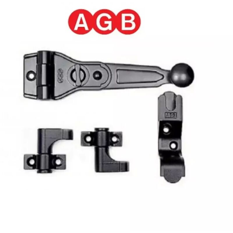 Confezione base per la chiusura della persiana con spagnoletta AGB modello UNICA per 1-2 ante (impugnatura snodata con guida asta, fermo per detta, ganci di chiusura dx+sx). Finitura acciaio verniciato nero.