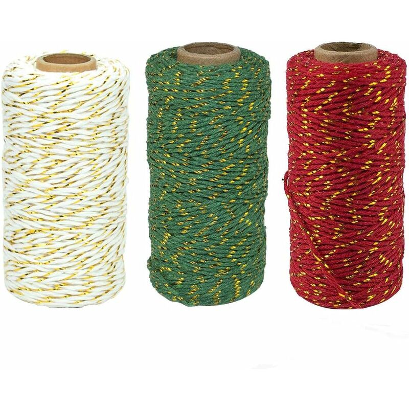 Linea regalo natalizia in cotone per prodotti da forno in corda di canapa a 3 volumi per confezionare forniture decorative da giardino per artigianato artistico 3 caratteristiche di colore: Materiali di alta qualità: queste corde per confezioni regalo natalizie sono realizzate in cotone e poliestere, resistenti all'usura resistente e durevole, adatto per uso esterno. alla sospensione, pacchi e altro ancora. Può accompagnarti a lungo Decorazione regalo di Natale: è una scelta perfetta per l'orticoltura, l'etichetta, l'invito per la decorazione di biglietti. Certo, puoi anche usare una corda per decorarlo sul tuo vaso da mescolare con la tua casa, adatto alla tua casa. con elementi natalizi Oro e bianco, verde e oro, rosso e dorato, molto eleganti, belli e dinamici, sono decorazioni ideali di scatole regalo come Natale, San Valentino, festa della mamma e altre scatole regalo. Esprimi il tuo cuore al tuo amante, alla tua famiglia e a tua madre Caratteristiche: Colore: oro e bianco, verde