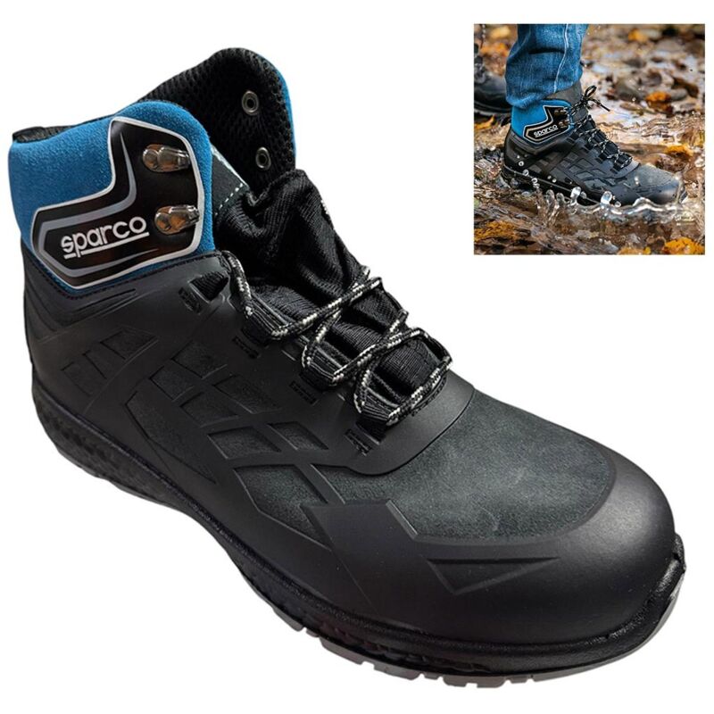 Sparco scarpa Arctic calzatura di sicurezza nero/azzurro S3 WR SRC per ambienti con elevata presenza di acqua e puntale in fibra di vetro. S3 WR SRC calzatura di sicurezza. Calzatura ideata per tutti coloro che sono costretti a operare in ambienti caratterizzati da elevata presenza di acqua. Le calzature WR sono infatti realizzate con materiali e tecniche che impediscono l'ingresso dell'acqua, pur garantendo un'ottima traspirabilita' e quindi un perfetto confort igrotermico. CARATTERISTICHE: - Certificazione: S3 WR SRC. - Puntale: Fibra di vetro, amagnetico, isolante, resistente a 200J. - Soletta: Antiperforazione in fibra tessile perforazione-zero. - Soletta removibile: Antistatica in PU. - Suola: Poliuretano bidensita' con assorbimento di energia sul tallone. - Fodera interna: Tessuto 3D microforato traspirante. - Metal free. - Soletta: In memory traspirante. - Tomaia: In pregiata pelle scamosciata idrorepellente. - Inserti: Microiniettati e speciale membrana DRS Water Resistant.