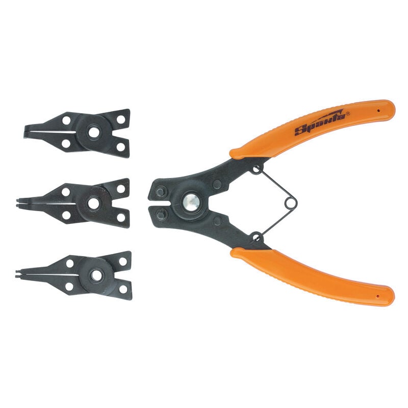 Una pinza sostituisce molte La pinza per anelli elastici SPARTA consente di lavorare con diversi tipi di anelli elastici grazie ai suoi punte intercambiabili. Sono fornite punte dritte, angolate a 45° e 90° con la pinza. Dotata di un meccanismo a molla di ritorno che consente un ritorno automatico della pinza alla posizione iniziale.