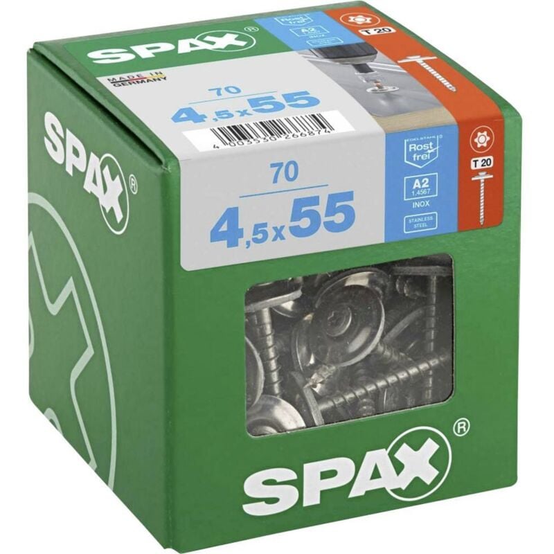 Spax Vite da lattoniere acciaio inossidabile A2, 4,5 x 55 mm, 70 Stk. Dimensioni: 4,5 x 55 mmQuantità: 70 Stk. Numero dell'articolo: 4577000450556EAN: 4003530266874 Lunghezza della filettatura: 47 mm Dimensione della lama: T20 Diametro della testa: 8 mm Lunghezza totale: 55 mm Descrizione La particolare impronta l'attacco è una cosiddetta testa svasata a cava esalobata. Rispetto ai tipi di attacchi meno precisi come Phillips o intaglio a croce, la superficie di attacco della nostra T-STAR plus è molto più grande e i bit T-STAR si innestano nella testa della vite sempre in modo ottimale. La massima e precisa trasmissione della forza dall'avvitatore alla vite che ne risulta tramite T-STAR plus consente di lavorare in modo facile, enormemente rapido e molto più efficiente rispetto a tutti gli altri attacchi.Per voi questo significa: il fastidioso slittamento del bit dalla testa della vite appartiene al passato e si possono realizzare interi avvitamenti in serie in brevissimo tempo!