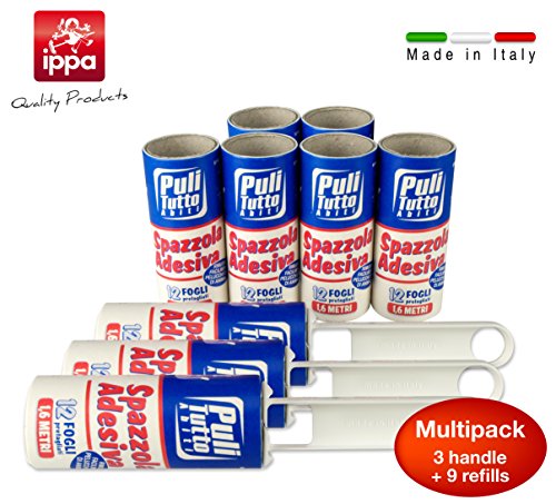 Spazzola adesiva. 9 rulli adesivi con 12 fogli pretagliati ciascuno + 3 manici. Totale 108 fogli adesivi (14.4 metri di carta adesiva)
