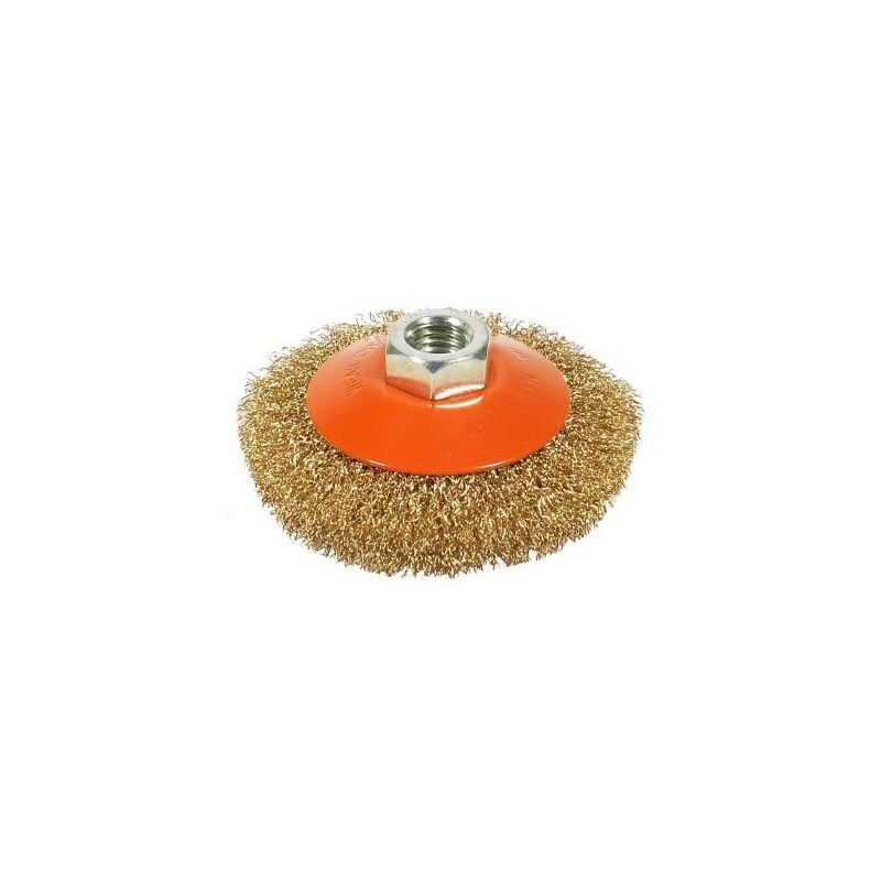 Dati tecnici: Diametro [mm]: 125 Registrazione: M14RPM max: 12500 Spazzola metallica angolata a disco Dotata di filo temprato ondulato Filo di acciaio Per rimuovere vernice, corrosione, pulire saldature, sbavare, ecc. Progettato per lavorare in luoghi difficili da raggiungere * *Le foto sono solo a scopo illustrativo.