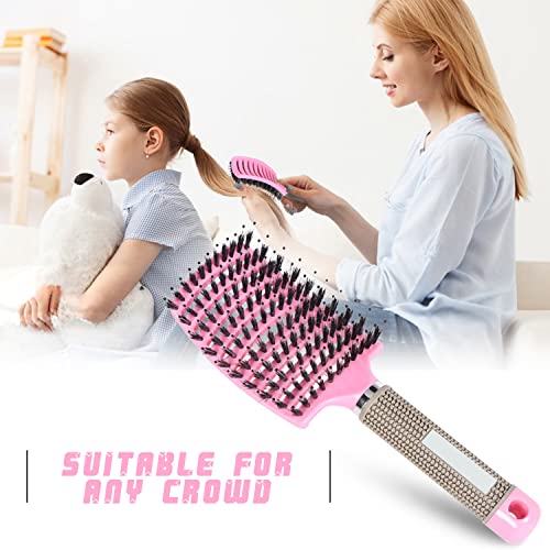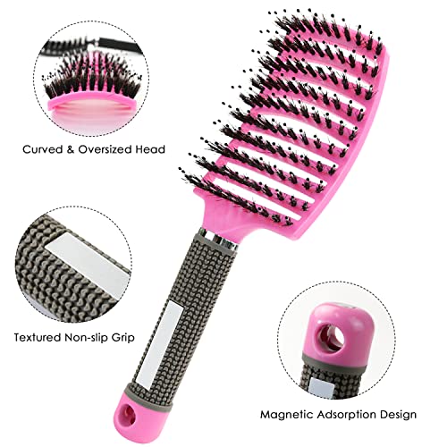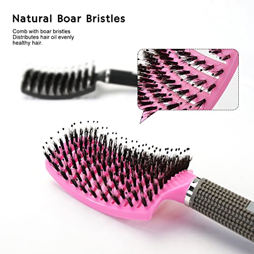 Spazzola per Capelli Curva con setole di Cinghiale - 2 Pezzi Spazzola Capelli con,Adatta Styling a Capelli Lunghi, Fini, Ricci o Lisci, Crespi, Mossi (Nero/Rosa)