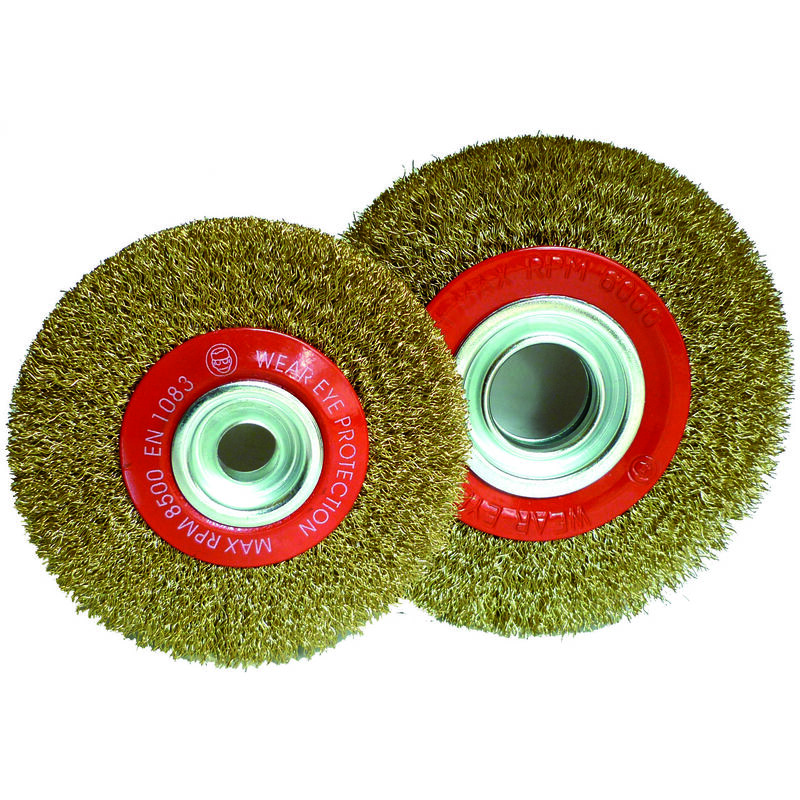 Fili in acciaio 0,30 mm, flange bloccate. Con boccole di riduzione. Per sverniciare, pulire metalli, togliere ruggine e saldatura. Diametro 120 mm. Spessore 20 mm. Foro 16 mm.