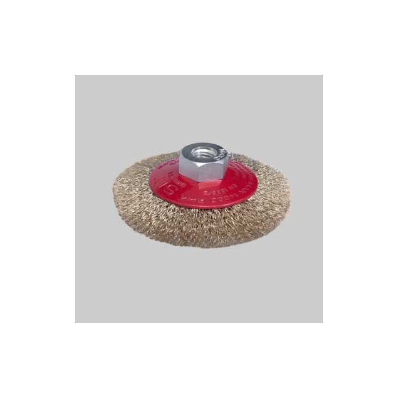 Filamenti in acciaio ottonato ondulato. Foro M14. Per utilizzo su smerigliatrici portatili, sia elettriche sia ad aria compressa, per lavori di rimozione scorie, ruggine e residui da superfici di ogni materiale e forma. Spazzola conica sit ø 90 mm SIT Spazzole acciaio sit