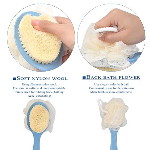 1 spazzola per il corpo per la schiena con spazzola per il corpo con manico per doccia con luffa, spazzola 2 in 1 per il corpo in rete, spugna per doccia a soffio, spugna per esfoliare, colore blu
