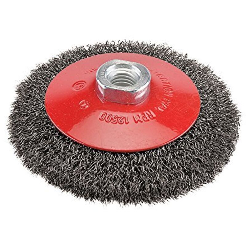 Alta resistenza filo di acciaio, 0,3 mm di diametro, per la ruggine e la rimozione della vernice, disincrostazione, la sbavatura e preparazione di cordoni di saldatura. Per le attività di fabbricazione dei metalli e lavorazione della pietra, pulizia e preparazione della superficie. Usare con smerigliatrici angolari. M14 x 2 filetto femmina.