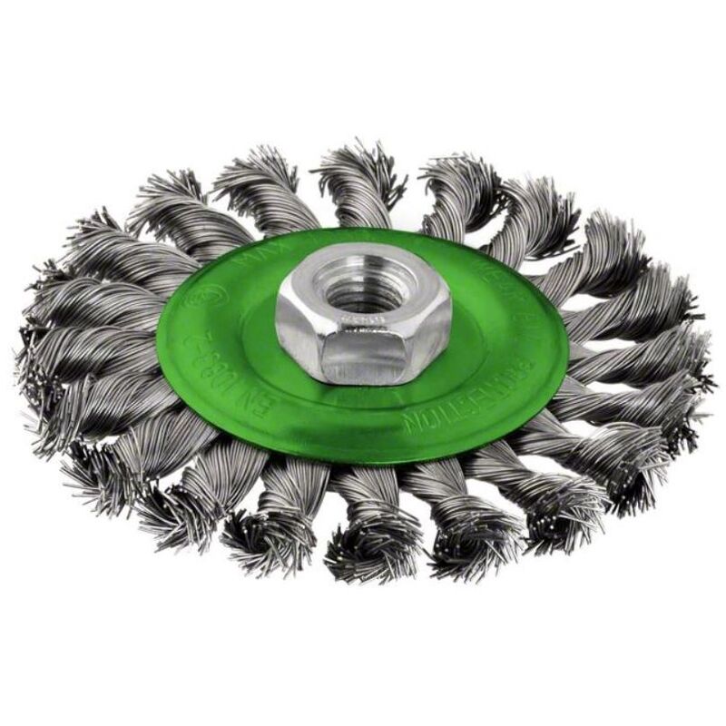 Spazzola del disco pesante per Inox con filo M 14. Spazzola in acciaio inossidabile per smerigliatrice angolare e smerigliatrice dritta. Cavo ottenuto. Inossidabile. Spessore del filo: 0,5 mm. Spazzola diametro: 115 mm. Numero di giri. Max. Min-1: 12500 rpm. Discussione: M 14. Adatto in modo ottimale per la pulizia di saldature su acciaio inossidabile. Adatto per lavori di pulizia pesanti ad alte velocità circonferenziali su superfici più piccole. In scanalature o sui bordi su acciaio inossidabile. Metalli in alluminio o non ferroso. Come rimuovere la ruggine forte. Colore. Declino. Sbavatura e decalcificazione. Adatto per tutte le spreli angolari con filettatura M 14 e GGS 6 s professionali.