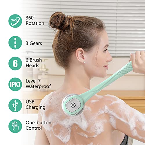 【6 in 1 Spazzola Posteriore Elettrica】: Spazzola corpo è dotata di 6 diverse testine funzionali per soddisfare le vostre diverse esigenze, che possono pulire efficacemente lo sporco nei pori, esfoliare i piedi e rivitalizzare la pelle. La spazzola da doccia non solo non danneggia la pelle sotto la doccia, ma la rende anche più liscia e morbida. Il gancio inferiore è progettato per essere riposto facilmente e può essere portato ovunque.