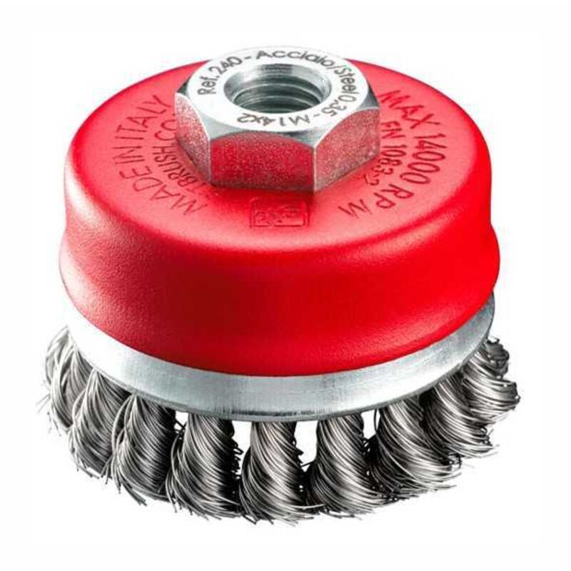 Spazzola a tazza con foro filettato MA14 F Fili acciaio ritorti mm 0,35/0,50 mazzetti 18/24 Diametro mm 70/95 Alt ezza fili mm 17/20 Ada tta per eliminazione scorie, ruggine, vernici