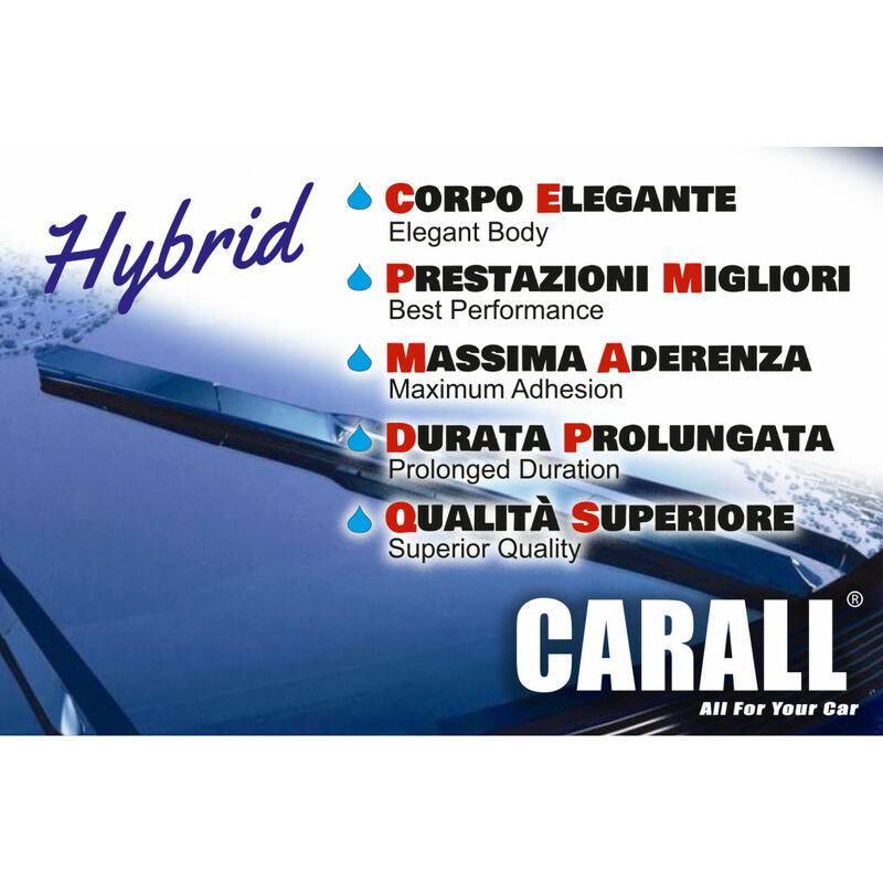 Spazzola Tergicristallo Ibrida CARALL Nuova Linea T191 Hybrid Totale 12 Misure Disponibili (Da 350mm A 700mm) Con 16 Attacchi Opzionali Compatibili Con il 99% delle Auto in Commercio Il Tergicristallo Hybrid Integra la Resistenza Della Spazzola Tradizionale e l'Aerodinamica Della Spazzola Flat La Pressione Uniforme Sull'intera Lunghezza della Spazzola Garantisce Il Massimo Contatto con Il Parabrezza. Fornisce Massima Visibilità e Sicurezza In Tutte Condizioni Climatiche. Marca: CARALL Modello:T191 Hybrid SKU: S19124 Misura: 24 600mm Universale: Si (Compatibile Con il 99% di Auto in Commercio) Attacco Incluso:A (Attacco Universale Per Più del 50% di Auto) Attacchi Opzionale: Codice S985B0: Attacco B1 New Per Braccio Pinch Tab 15mm? Codice S985B1: Attacco B1 Per Braccio Pinch Tab 15mm? Codice S985B2: Attacco B2 Per Braccio Push Button 16mm e Push Button 19mm? Codice S985B3: Attacco B3 Per Braccio Bayonet 9x4mm? Codice S985B4: Attacco B4 Per Braccio Push Button 16mm? Codice
