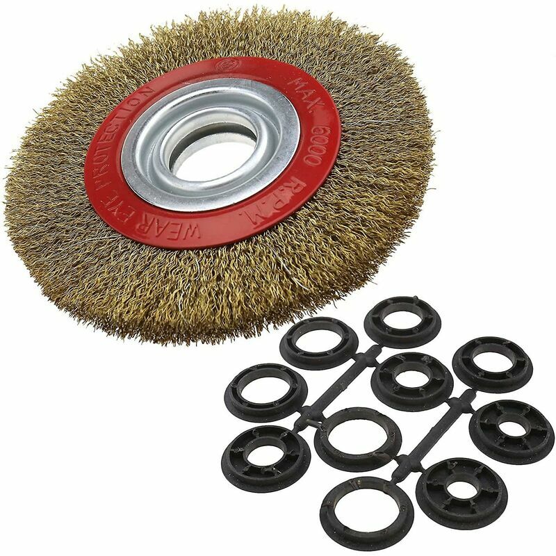 Per pulire, rimuovere ruggine, vernice, sbavature metalliche e lucidare Per pulire saldature e rimuovere sbavature da metalli lavorati Setole in acciaio temprato 0,3 mm Diametro: 150 mm Dimensione foro: 32 mm Descrizione articolo: Indicato sulla confezione La spazzola è compatibile con smerigliatrici angolari. Questo è un errore di stampa, questo pennello non può essere utilizzato con una smerigliatrice angolare. - Per pulire, rimuovere ruggine, vernice, sbavature metalliche e lucidare. - Per la pulizia di saldature metalliche e la rimozione di sbavature dal metallo lavorato - Setole in filo di acciaio temprato da 0,3 mm Dimensioni dell'anello adattatore: 5 paia sono utilizzate per spazzole da 6 pollici incluse 12,70 mm, 15,88 mm, 19,05 mm, 22,23 mm e 25,40 mm Velocità massima: 4500 giri/min (spazzola da 6 "o 8") - Da utilizzare con smerigliatrice da banco Contenuto della confezione: una spazzola metallica con fili di acciaio Specifiche dell'articolo: Materiale: acciaio Diametro del