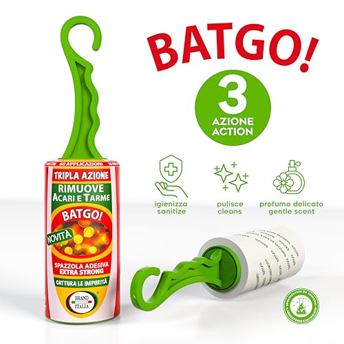 SPAZZOLA TRIPLA AZIONE BAT-GO: CON IL SUO POTENTE ADESIVO RIMUOVE ACARI, BATTERI E TARME - GRAZIE ALLA PROFUMAZIONE A BASE DI OLII ESSENZIALI NE IMPEDISCE IL RIOTRNO E PROFUMA ARMADI E CASSETTI