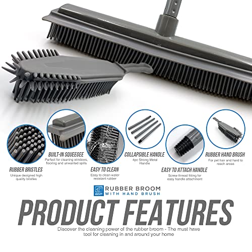Set di spazzole in gomma e gomma Scopa morbida per interni, moquette e peli per animali domestici con testina in gomma da 31 cm e manico in acciaio inox a 4 sezioni da 120 cm, viene fornito con una