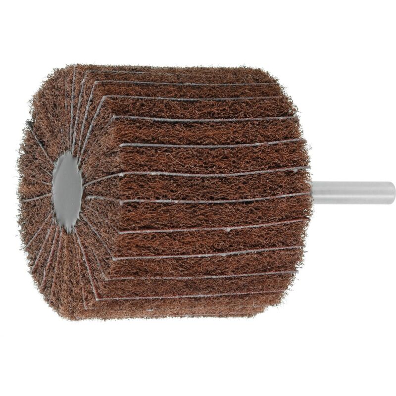 Disposizione a ventaglio delle lamelle attorno all'asse dell'utensile. La combinazione con tela abrasiva aumenta l'azione levigante del tessuto. ⌀ Codolo 6 mm. Uso: Per rimuovere impurità e strati di ossido dai metalli, nonché per opacizzare gli acciai al Cr-Ni e altri metalli legati, ma anche metalli non ferrosi. Dati tecnici GG(G) m/s idoneo Acciaio < 67 HRC m/s limitatamente adatto Alluminio, CFRP m/s idoneo Acciaio < 1400 N/mm² m/s idoneo a secco idoneo Acciaio < 900 N/mm² m/s idoneo CuZn m/s idoneo INOX m/s idoneo Acciaio < 60 HRC m/s limitatamente adatto Acciaio < 55 HRC m/s idoneo Legno m/s idoneo Vernice m/s limitatamente adatto Al/Mg m/s idoneo Ti m/s limitatamente adatto Grado di finezza medio Sigla materiale abrasivo A Confronto granulometrico 180 / 150 Attributo del nome del prodotto medio Tipo di prodotto Spazzole lamellari in tessuto abrasivo con gambo ⌀ Testa, mm 80 Velocità consigliata, min-1 4.000 Numero massimo giri, min-1 7.000 ⌀ Gambo, mm 6 Larghezza della testa
