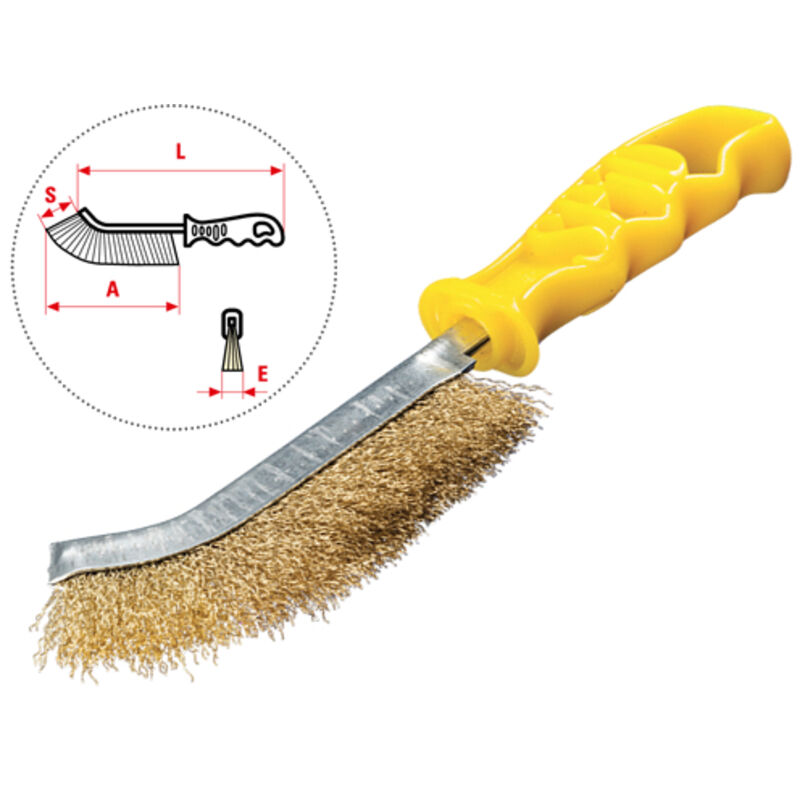 Spazzole Spid ottone Spazzola manuale universale. La superficie ristretta, la particolare curvatura ed il manico ergonomico consentono di lavorare con forte pressione e di raggiungere spazi di difficile accesso Ideale per rimuovere ruggine, vernice e sporco da qualsiasi superficie. Filo ottone Ø 0,3 mm. Dimensioni: L 245 mm. - A 135 mm. - S 28 mm. - E 15 mm.