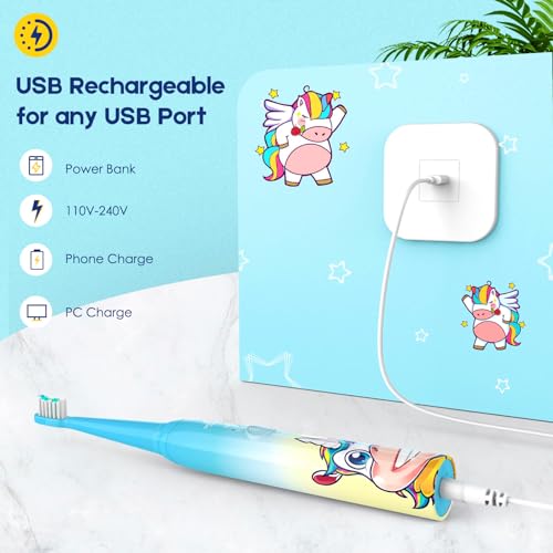 Spazzolino Elettrico per Bambini Ragazzi e ragazze, Unicorno Ricaricabile 3 Modalità con Indicatore Luminoso Spazzolino Sonico per Pulizia Dentale Timer con 4 Testine per spazzolini (Blu)