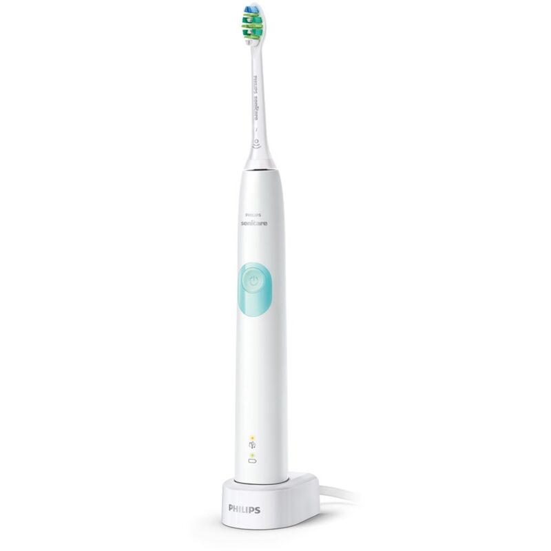 Spazzolino da denti Philips ProtectiveClean 4300 HX6807/63. Questo spazzolino rimuove fino a 7 volte più placca rispetto a uno spazzolino tradizionale - La testina angolata consente un migliore accesso ai denti posteriori e ai punti difficili da raggiungere - Tecnologia sonica adatta all'uso con apparecchi ortodontici, otturazioni, corone e faccette, aiuta a prevenire carie e migliorare la salute delle gengive - L'avanzata tecnologia sonica di Philips Sonicare fa pulsare l'acqua tra i denti, mentre i movimenti del frammento dello spazzolino spazzano via la placca - Modalità di spazzolatura 1 Clean per un'eccezionale pulizia quotidiana - La funzione EasyStart regola il livello di potenza dello spazzolino durante la prima 14 utilizzi per aiutarti nel passaggio tra le due tipologie di spazzolino - Sensore di pressione: ti avviserà tramite impulsi sonori per ricordarti di ridurre la pressione - Temporizzatore Quadpacer per la spazzolatura completa della bocca, un segnale acustico ogni 30