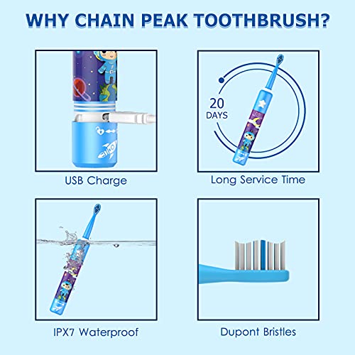 Spazzolino Elettrico Musicale per Bambini, Spazzolino Intelligente Ricaricabile per Bambini da 3 a 12 Anni Con Timer di 2 Minuti, 3 Modalità, 4 Testine (Blu)