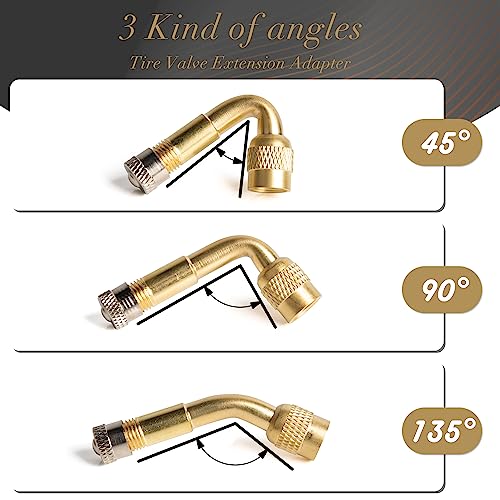 【Design a curvatura angolare】Questo set di estensori per valvole ha 3 tipi di angoli, 45 gradi, 90 gradi e 135 gradi. Risolvono con successo il problema dell'impossibilità di utilizzare la pompa a pedale per controllare la pressione del pneumatico o per gonfiarlo a causa della mancanza di spazio tra la valvola del pneumatico e i raggi della ruota.