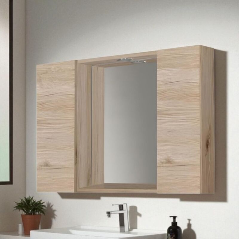 Specchiera da bagno a due ante 81x60x16 cm con Faretto Led. Lo specchio bagno e' un elemento fondamentale di arredo, e la scelta non deve essere scontata. Facilmente adattabile a qualsiasi bagno e grazie al suo design avrai la possibilita' di tenere a portata di mano i tuoi prodotti da bagno. Il mobile arrivera' completamente montato, occorrera' solo fissarlo a parete. CARATTERISTICHE Colore: Quercia Naturale Materiale: Mdf/Nobilitato Dimensioni: Larghezza 81 cm / Altezza 60 cm / Profondita' 16 cm Peso: 18 kg Illuminazione: Faretto LED Installazione Faretto LED: collegare i cavi di uscita del faretto ai rispettivi conduttori dell'impianto elettrico tramite morsettiera di giunzione. Ante: 2 Ripiani in vetro: 2 per anta