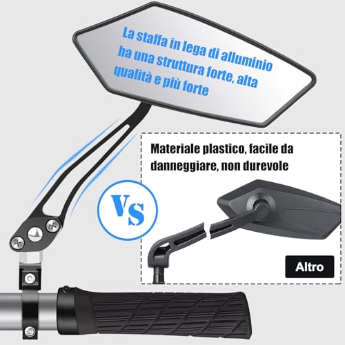 【Specchietti per Bici Regolabili a 360 °】 Lo specchietto retrovisore è regolabile a qualsiasi angolazione, su e giù o lateralmente a qualsiasi angolazione desiderata. Lo specchio della bici è fissato saldamente con viti, può essere montato sul manubrio sinistro e destro. Così facile da regolare, scegli NOI!
