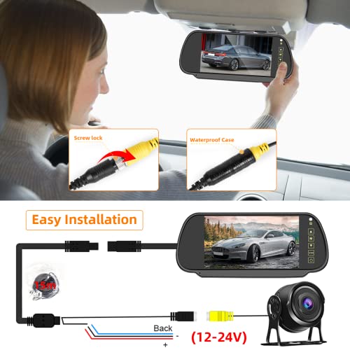 Specchietto Retrovisore per Auto Telecamera Posteriore 7 Pollici LCD Monitor y Telecamera Per Retromarcia Impermeabile, Visione notturna, Immagini a Specchio/Normali, Cavo da 15 m, 12V-24V