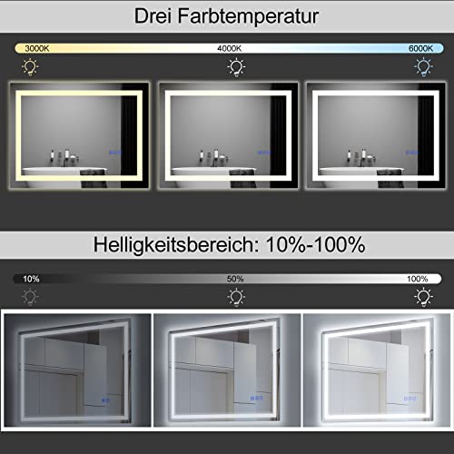[Specchio da bagno con illuminazione] ▶ La striscia luminosa dietro lo specchio è incassata, più stabile e non cade rispetto a quelle incollate. La luminosità dello specchio LED può essere regolata dal 10% al 100% e lo specchio a parete ha tre temperature di colore: bianco freddo (6000K), bianco naturale (4000K) e bianco caldo (3000K). L'illuminazione è piacevole e non abbaglia.