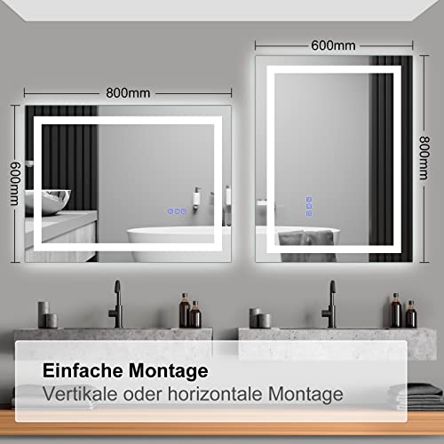Specchio Bagno con Luce 80 x 60 cm, Specchio LED a 3 colori luminosi per il bagno, specchio luminoso di dimensioni dal 10% al 100% di luminosità con antiappannamento, con funzione di memoria, IP54