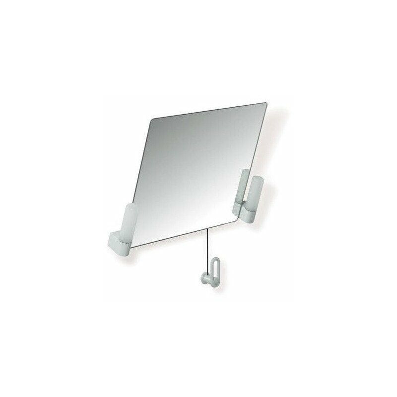 Specchio rettangolare in cristallo con bordi a terra, pellicola di protezione a scheggia incorporata e lampade cilindriche montate lateralmente, lo specchio può essere inclinato di un massimo di 28° con maniglia e corda rotanti ed è quindi da utilizzare in piedi e in seduta, per il montaggio a parete, per il montaggio con pretesto dello sterzo della corda incluso, con due lampade fluorescenti compatte integrate a risparmio energetico FSD 9 W, presa G 23, a prova di spruzzi, grado di protezione IP 44, classe di protezione II, specchio largo 600 mm, spessore 6 mm, apparecchi alti 195 mm, specchio in vetro cristallo, coperchio dell'apparecchio in vetro acrilico resistente ai raggi UV, elementi di fissaggio, maniglia rotante e portalame in poliammide