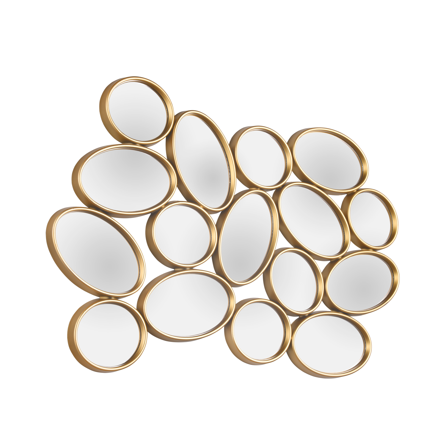 Con il suo design innovativo e la sua finitura oro lucente, lo specchio Madita aggiunge un tocco di glamour e sofisticatezza. Le forme ovali, sapientemente disposte, creano un effetto visivo dinamico e armonioso, donando movimento e originalità alle pareti. La cornice in plastica con finitura oro aggiunge un tocco di lusso e calore, richiamando l'eleganza degli arredi classici e la modernità delle tendenze contemporanee. Questo specchio è perfetto per esaltare l'arredamento di soggiorni, ingressi, camere da letto e persino bagni, diventando il punto focale di ogni stanza. Dimensioni: 90x61x2,5 cm.