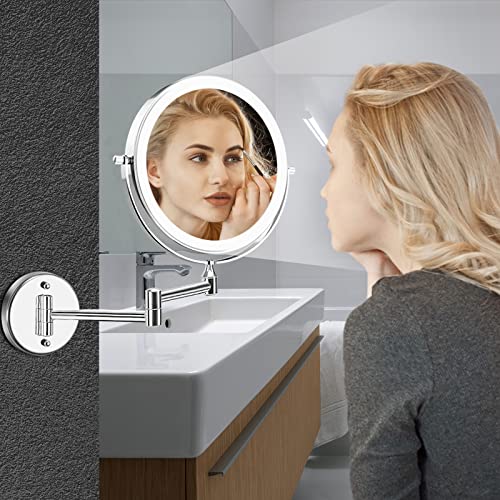 Specchio da trucco ricaricabile da parete da 2000 mAh, con luce da 8" 1X/10X ingranditore illuminato da trucco 3 modalità di colore, luce regolabile, touch screen, ricarica tramite USB, specchio estensibile da donna
