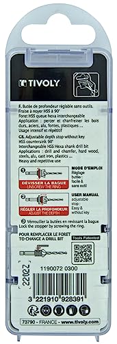 Kit speciale per terrazza Ø 3 mm brevettato da TIVOLY composto da una punta HSS con coda esagonale intercambiabile per forare e smussare a 90° i legni duri, acciaio, alluminio, ghisa e plastiche per uso intensivo e ripetitivo + fresa per noce + arresto regolabile. Include una chiave per cambiare la punta rapidamente senza vincoli. Montato su adattatore esagonale 6,35 mm per montaggio su avvitatore. Prodotto professionale di alta qualità