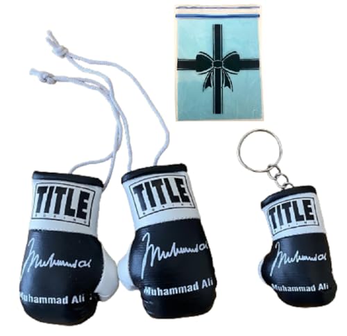[GUANTI E PORTACHIAVI] Un paio unico di guanti da boxe neri Muhammad Ali Mini che possono essere appesi allo specchietto retrovisore dell'auto e possono anche essere appesi a casa come accessorio o legati a una borsa. Il portachiavi Muhammad Ali può essere attaccato a qualsiasi chiave ed è della dimensione perfetta da aggiungere a qualsiasi chiave. Stampato autografato su entrambi.