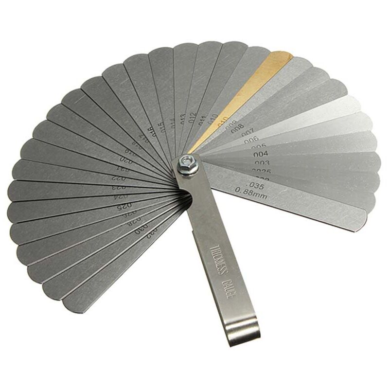 Materiale: lo spessimetro è realizzato in acciaio temprato con un rivestimento di olio lubrificante, che può prevenire vaiolature e corrosione ed è durevole Doppie misure contrassegnate: Da 0,0015 pollici a 0,035 pollici (da 0,04 mm a 0,88 mm) Portatile: la lamina di rame del prodotto è morbida e pieghevole, con 32 diversi spessori, pieghevole e comoda da trasportare Funzione: Spessimetro utilizzato per misurare lo spazio tra gli oggetti, come lo spessore del gioco delle punterie, gli spazi dei cuscinetti, gli spazi delle candele, ecc. Ampia applicazione: lo spessimetro utilizzato per qualsiasi cosa, dalle chitarre ai motori e altri oggetti difficili da raggiungere luoghi, è un buon aiuto per progettisti, ingegneri e meccanici Strumento per set di cunei meccanici in acciaio a 32 lame Strumento di misurazione del gap metrico e imperiale con doppia marcatura del gioco delle candele Specifiche Nome prodotto:Set spessimetro Materiale: acciaio Colore:argento Dimensioni metriche (mm)