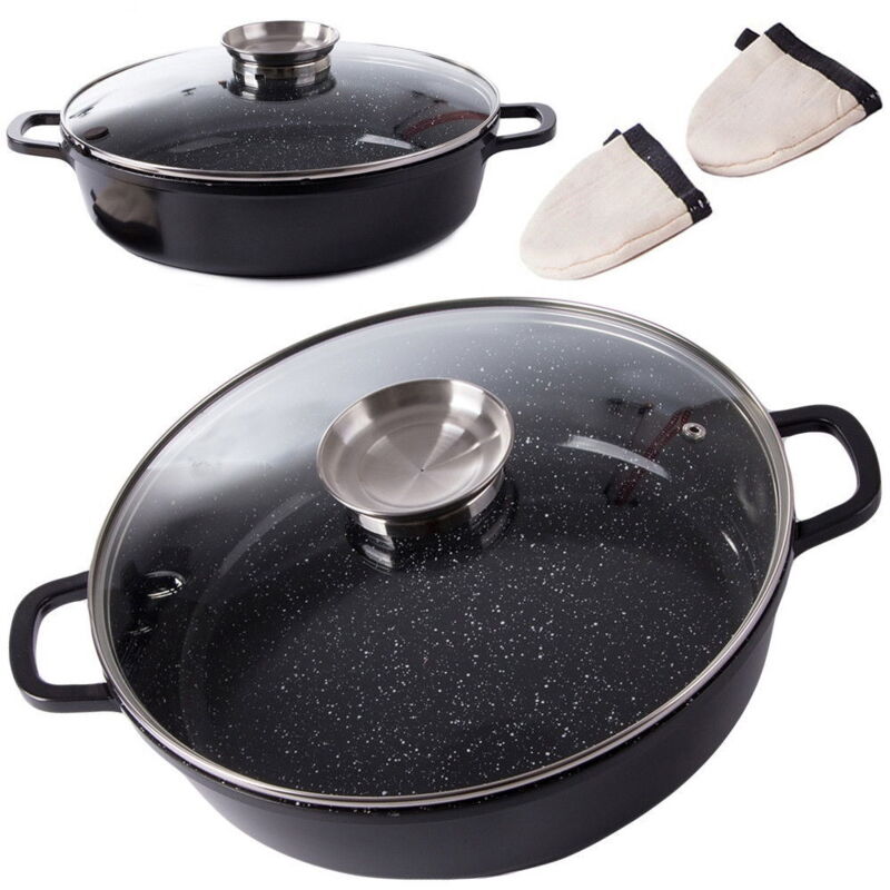Uno spezzatino arrosto è un must in ogni cucina! Questo arrosto in umido ha un'efficace distribuzione del calore che ne consente l'utilizzo su tutti i tipi di fornelli e una superficie antiaderente che impedisce al cibo di bruciarsi. Inoltre è dotato di un coperchio in vetro con aromatizzatore integrato che puoi utilizzare per aggiungere sapori entusiasmanti al cibo. - pentola per arrosti con tappo in vetro - Superficie antiaderente - Aromatizzatore integrato Specifiche: Colore: nero Materiale: alluminio e vetro Diametro: 32 cm Altezza: 8 cm Capacità volumetrica: 5,7 l